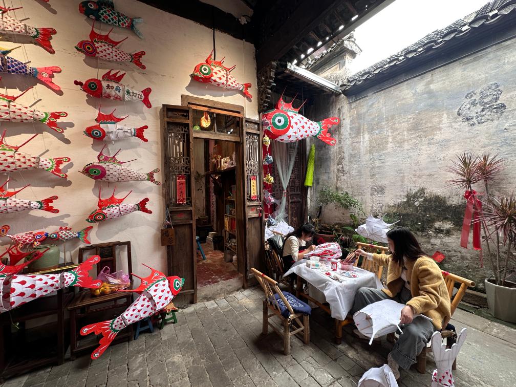 在歙县斗山街“鱼你有约”小店,几十平方米的店肆里“挤”满大小不一的鱼灯,店肆主办人潘敏正手把手教客人制造鱼灯,扎竹骨、糊彩纸、绘鳞纹……指尖起落间,朴素资料便有了鱼跃灯影的神韵。